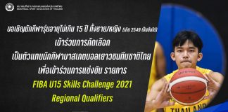 ขอเชิญนักกีฬาเข้าร่วมการคัดเลือกเป็นตัวแทนนักกีฬาบาสเกตบอลเยาวชนทีมชาติไทย เพื่อเข้าร่วมการแข่งขัน รายการ FIBA U15 Skills Challenge 2021 Regional Qualifiers