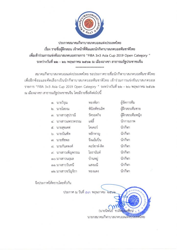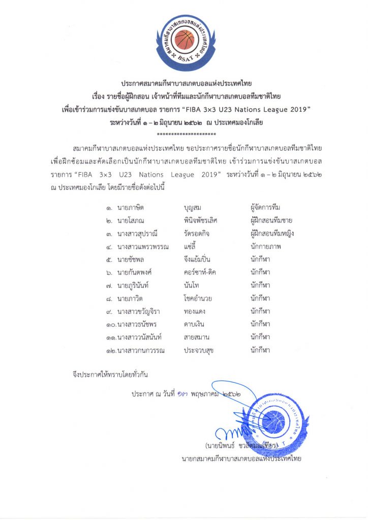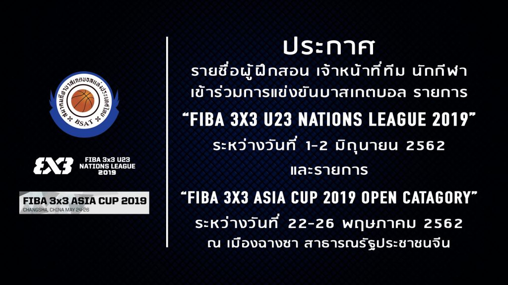 สมาคมกีฬาบาสเกตบอลแห่งประเทศไทย ขอประกาศรายชื่อนักกีฬาบาสเกตบอลทีมชาติไทยเพื่อฝึกซ้อมและคัดเลือกเป็นนักกีฬาบาสเกตบอลทีมชาติไทย เข้าร่วมการแข่งขันบาสเกตบอลรายการ “FIBA 3X3 U23 NATIONS LEAGUE 2019” ระหว่างวันที่ 1-2 มิถุนายน 2562 ณ ประเทศมองโกเลีย และรายการ “FIBA 3X3 ASIA CUP 2019 OPEN CATAGORY” ระหว่างวันที่ 22-26 พฤษภาคม 2562 ณ เมืองฉางซา สาธารณรัฐประชาชนจีน