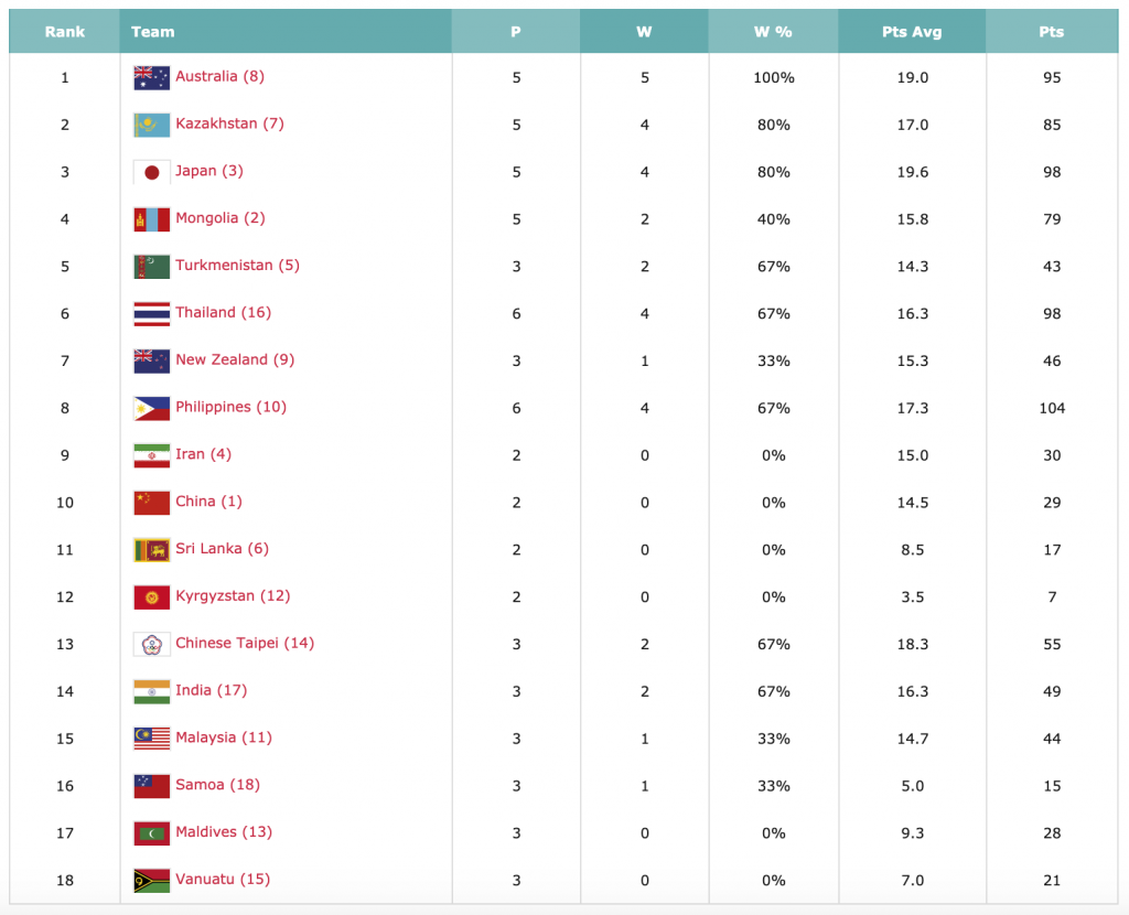 ซึ่งในนัดแรกรอบ 16 ทีม สาวไทยสามารถล้มยักษ์ อิหร่าน 21-14 คะแนน และนัดที่สอง พ่ายให้กับ เติร์กเมนิสถาน 11-7 คะแนน ส่งผลให้ทีมสาวไทยก้าวเข้าสู่รอบ 8 ทีมเป็นอันดับ 2 ของสายต่อไป โดยในรอบ 8 ทีม ทีมชาติไทย ต้องพบกับทีมชาติคาซัคสถาน ผลปรากฎว่า สาวไทย ที่เสียเปรียบเรื่องรูปร่าง พ่ายไปในที่สุดแบบสูสี 21-19 คะแนน หยุดเส้นทางอยู่ที่รอบ 8 ทีม