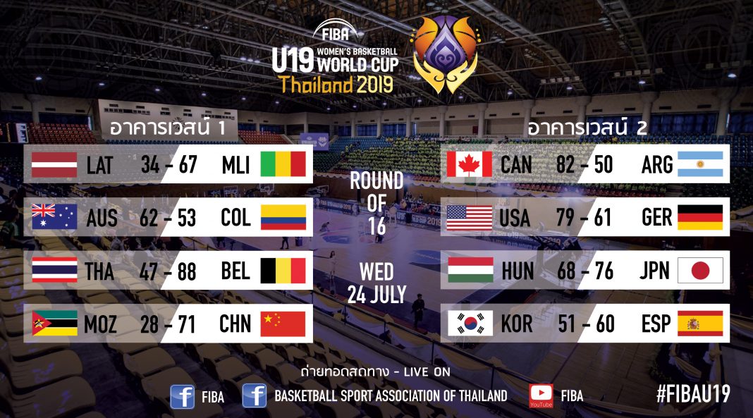 สรุปผลการแข่งขันบาสเกตบอล ฟีบ้าหญิงชิงแชมป์โลก รุ่นอายุไม่เกิน 19 ปี ประจำวันพุธ ที่ 24 กรกฎาคม 2562 ทั้งสนามอาคารกีฬาเวสน์ 1 และ 2 ศูนย์เยาวชนกรุงเทพมหานคร โดยผลการแข่งขันของทุกคู่ มีดังต่อไปนี้