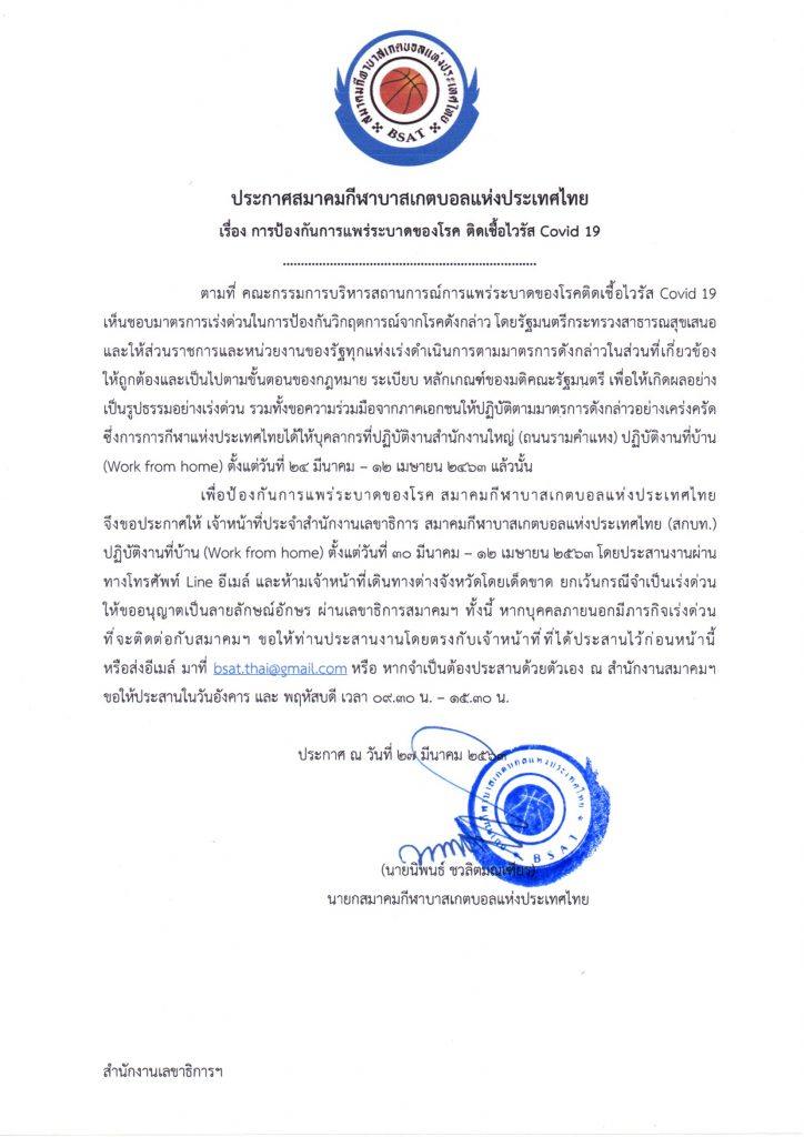 เพื่อป้องกันการแพร่ระบาดของโรค สมาคมกีฬาบาสเกตบอลแห่งประเทศไทย จึงขอประกาศให้ เจ้าหน้าที่ประจำสำนักเลขาธิการ สมาคมกีฬาบาสเกตบอลแห่งประเทศไทย (สกบท.) ปฎิบัติงานที่บ้าน (Work from home) ตั้งแต่วันที่ 30 มีนาคม – 12 เมษายน 2563 โดยประสานงานผ่านทางโทรศัพท์ Line อีเมล์ และ ห้ามเจ้าหน้าที่เดินทางต่างจังหวัดโดยเด็ดขาด ยกเว้นกรณีจำเป็นเร่งด่วน ให้ขออนุญาตเป็นลายลักษณ์อักษร ผ่านเลขาธิการสมาคมฯ ทั้งนี้หากบุคคลภายนอก มีภารกิจเร่งด่วนที่จะติดต่อกับสมาคมฯ ขอให้ท่านประสานงานโดยตรงกับเจ้าหน้าที่ ที่ได้ประสานงานไว้ก่อนหน้านี้ หรือส่งอีเมล์ มาที่ bsat.thai@gmail.com หรือหากจำเป็นต้องประสานด้วยตัวเอง ณ สำนักงานสมาคมฯ ขอให้ประสานในวันอังคาร และ พฤหัสบดี เวลา 09.30 น. – 15.30 น