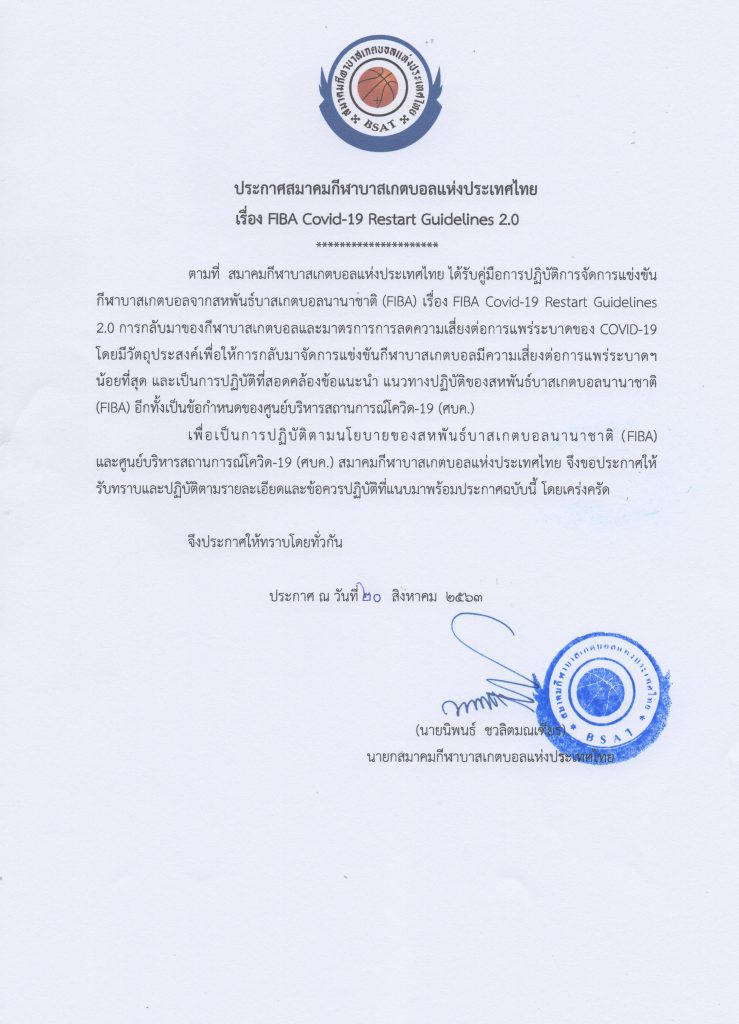 เพื่อเป็นการปฎิบัติตามนโยบายของสหพันธ์บาสเกตบอลนานาชาติ (FIBA) และ ศูนย์บริหารสถานการณ์โควิด-19 (ศบค.) สมาคมกีฬาบาสเกตบอลแห่งประเทศไทย จึงขอประกาศให้รับทราบและปฎิบัติตามรายละเอียดและข้อควรปฎิบัติที่แนบมาพร้อมประกาศฉบับนี้ โดยเคร่งครัด