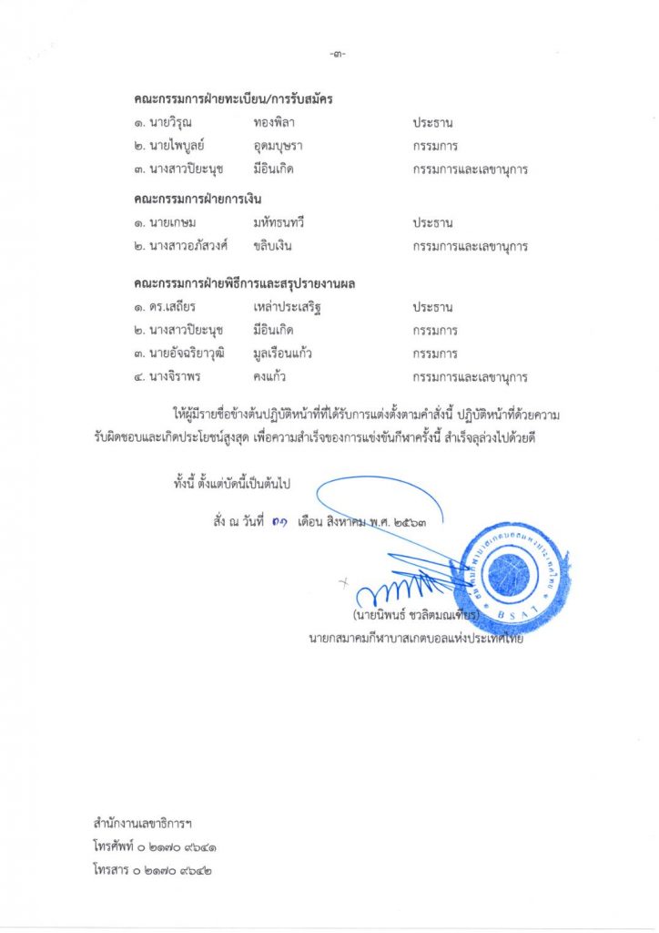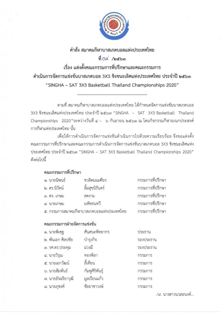 เรื่อง แต่งตั้งคณะกรรมการที่ปรึกษาและคณะกรรมการดำเนินการจัดการแข่งขันบาสเกตบอล 3×3 ชิงชนะเลิศแห่งประเทศไทย ประจำปี 2563 ” SINGHA-SAT 3×3 Basketball Thailand Championship 2020″