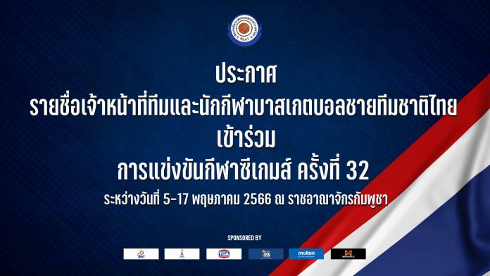 สมาคมกีฬาบาสเกตบอลแห่งประเทศไทย ขอประกาศรายชื่อ เจ้าหน้าที่ และนักกีฬาบาสเกตบอลทีมชาติไทย เดินทางเข้าร่วมการแข่งขันกีฬาซีเกมส์ ครั้งที่ ๓๒ ระหว่างวันที่ ๕ – ๑๗ พฤษภาคม ๒๕๖๖ ณ ราชอาณาจักรกัมพูชา โดยมีรายชื่อดังต่อไปนี้