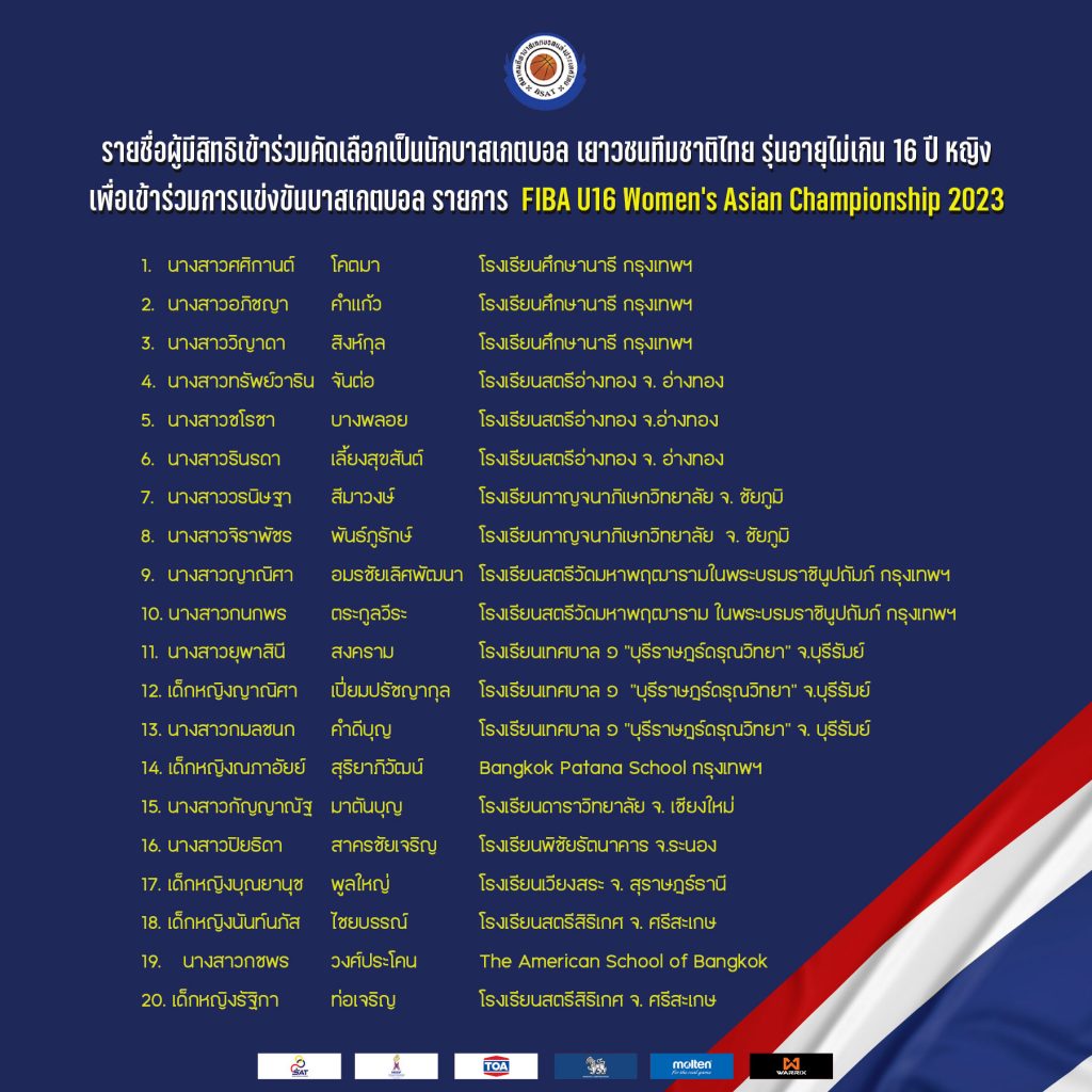 ที่ผ่านการคัดเลือกเพื่อเก็บตัวฝึกซ้อมเข้าร่วมแข่งขัน รายการ “FIBA U16 Women’s Asian Championship 2023”