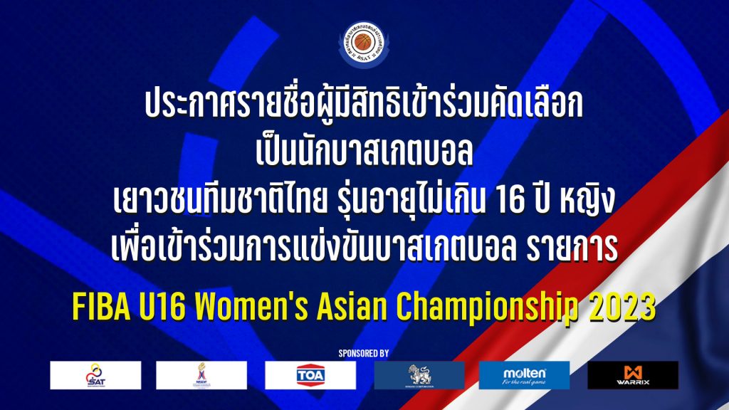 ตามที่ สมาคมกีฬาบาสเกตบอลแห่งประเทศไทย ได้ประกาศคัดเลือกตัวนักกีฬาบาสเกตบอลหญิงทีมชาติไทย รุ่นอายุไม่เกิน 16 ปี เพื่อเข้าร่วมแข่งขันรายการ“FIBA U16 Women’s Asian Championship 2023”ระหว่างวันที่ 10-16 กรกฎาคม 2566 ณ กรุงอัมมาน ประเทศจอร์แดน เมื่อวันที่ 3 มิถุนายน 2566 นั้น