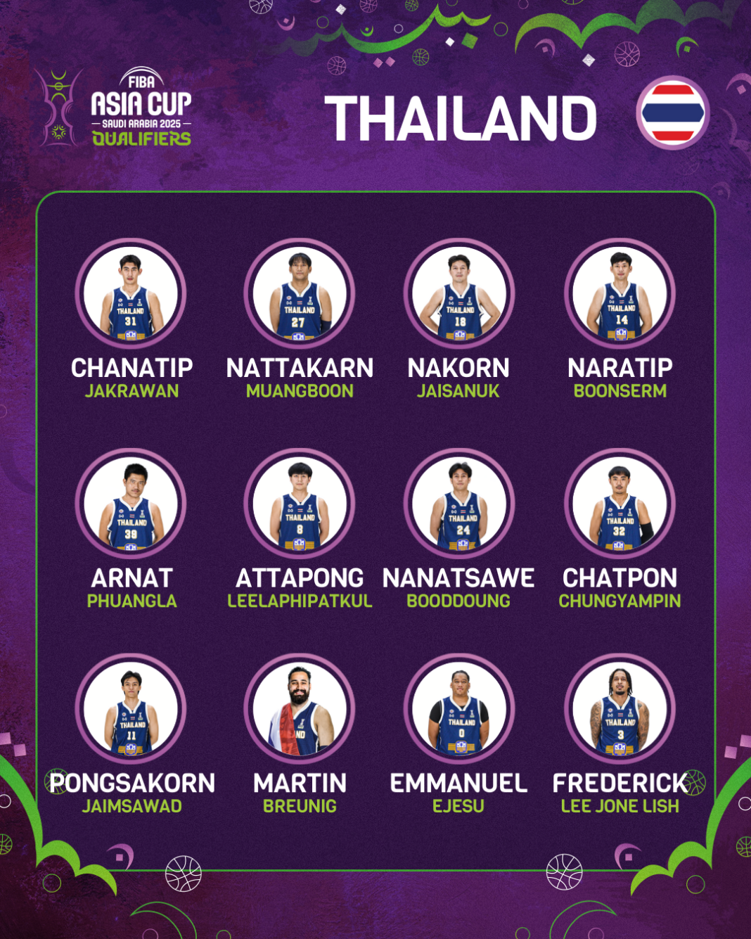 สมาคมกีฬาบาสเกตบอลแห่งประเทศไทย ขอประกาศรายชื่อเจ้าหน้าที่ และนักกีฬาบาสเกตบอลชายทีมชาติไทย เข้าร่วมการแข่งขันบาสเกตบอลชายชิงชนะเลิศแห่งเอเชีย รายการ FIBA Asia Cup 2025 Qualifiers – Window 2 วันที่ 21 พฤศจิกายน 2567 ณ อาคารกีฬานิมิบุตร สนามกีฬาแห่งชาติ กรุงเทพมหานคร และเดินทางเข้าร่วมการแข่งขัน วันที่ 24 พฤศจิกายน 2567 ณ กรุงจาการ์ตา ประเทศอินโดนิเซีย ดังนี้