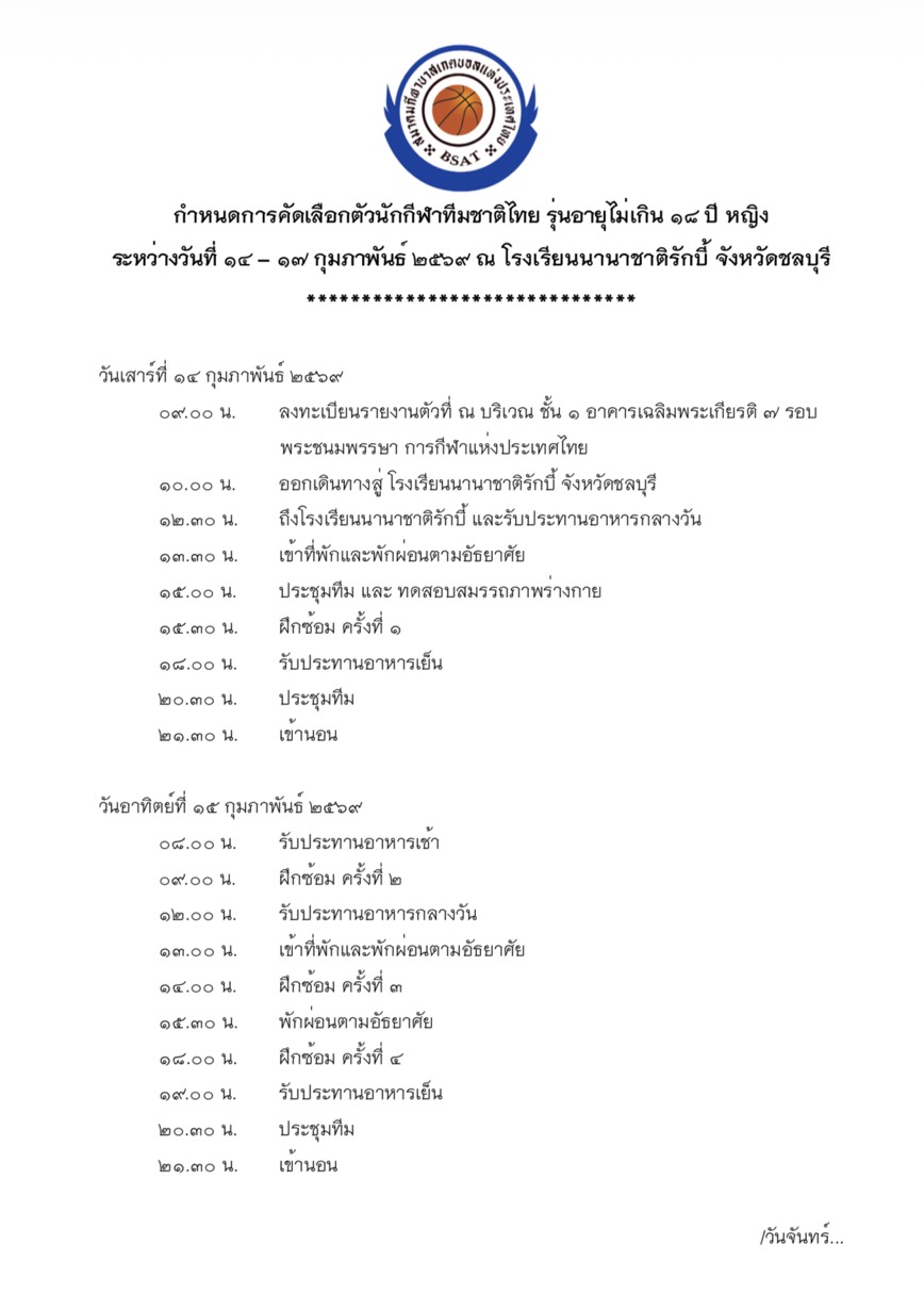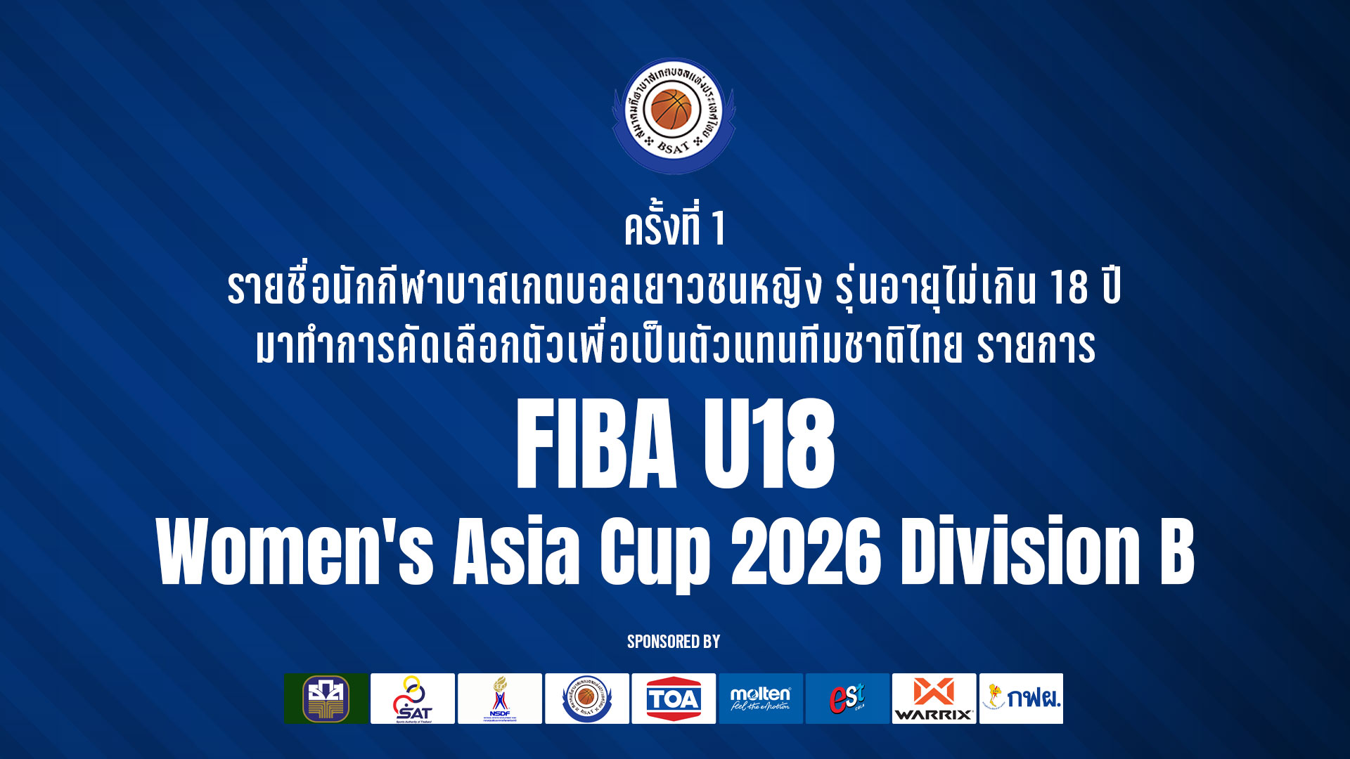 สมาคมกีฬาบาสเกตบอลแห่งประเทศไทย ขอประกาศรายชื่อนักกีฬาบาสเกตบอลหญิง ครั้งที่ 1 เพื่อเก็บตัวฝึกซ้อม ระหว่างวันที่ 14-17 กุมภาพันธ์ 2569 ณ โรงเรียนนานาชาติรักบี้ จังหวัดชลบุรี และคัดเลือกเป็นตัวแทนนักกีฬาบาสเก็ตบอลหญิงทีมชาติไทย เพื่อเข้าร่วมการแข่งขัน FIBA U18 Women’s Asia Cup 2026 Division B.