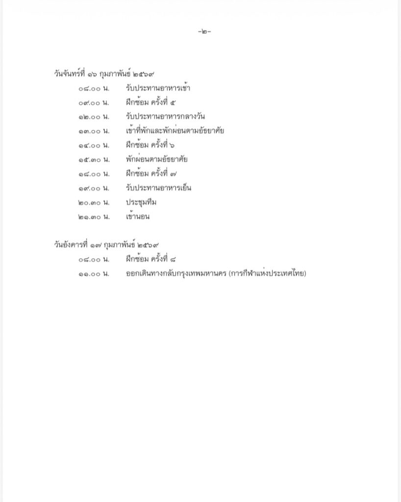 ให้นักกีฬาที่มีรายชื่อทั้งหมด มารายงานตัว ในวันที่ 14 กุมภาพันธ์ 2569 ณ บริเวณชั้น 1 อาคารเฉลิมพระเกียรติ 7 รอบพระชนมพรรษา การกีฬาแห่งประเทศไทย ในเวลา 09.00 น. ก่อนเดินทางไปเก็บตัวฝึกซ้อมที่ โรงเรียนนานาชาติ รักบี้ จ.ชลบุรี ดังรายละเอียดการรายงานตัวนี้