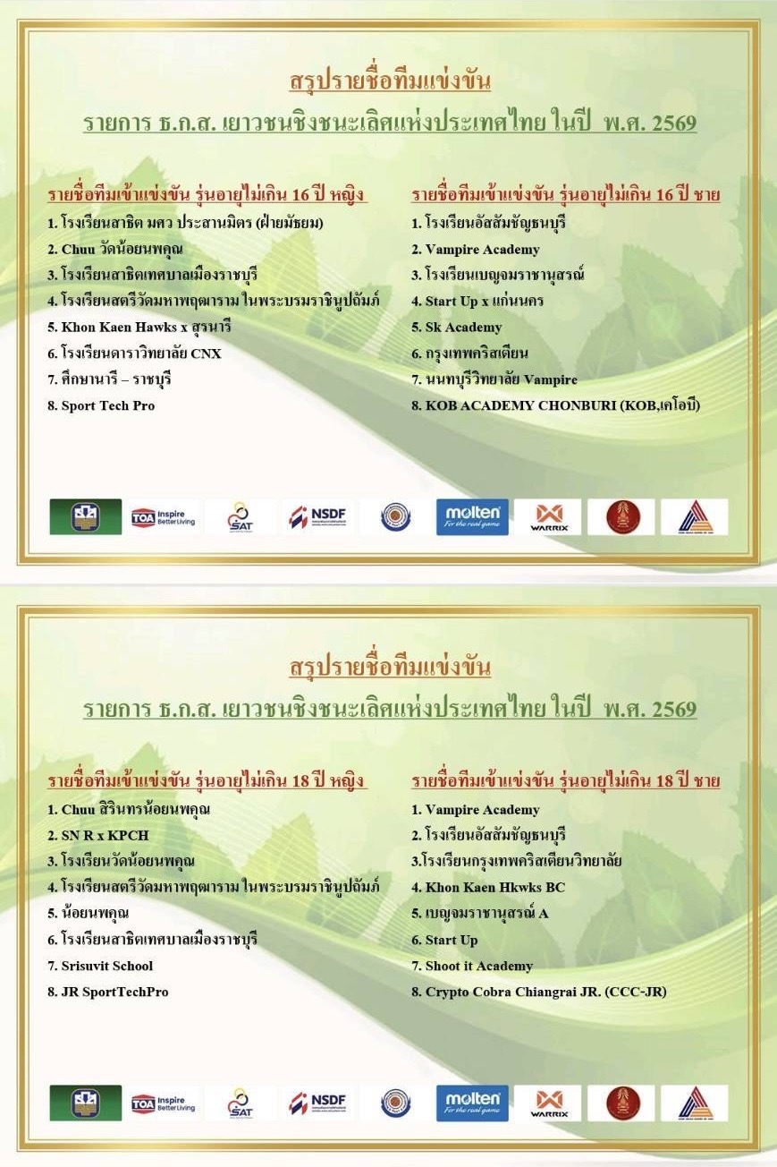 ตามที่ สมาคมกีฬาบาสเกตบอลแห่งประเทศไทย ขอกำหนดการแข่งขันบาสเกตบอล ธ.ก.ส. เยาวชนชิงชนะเลิศแห่งประเทศไทย ประจำปี 2569 รุ่นอายุไม่เกิน 16 ปี และ 18 ปี ประเภทชาย,หญิง ระหว่างวันที่ 26 มีนาคม – 5 เมษายน 2569 ณ สนามบาสเกตบอลสโมสรไฮเทค ซอยประชาอุทิศ 74/1 โดยขอประกาศรายชื่อทีมที่เข้าร่วมการแข่งขันฯ และระเบียบการแข่งขันแนบดังนี้